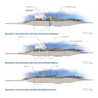 Knubble Dune: In spring/summer 2015, D&F worked with CLE engineering and Buzzards Bay Coalition to generate ideas for how to improve access and resilience of a dune area adjacent to a point of rocks in Westport, MA, known as the Knubble. We developed a series of illustrations to help the project team and town visualize alternatives that sand fill and additional dune plantings with pedestrian and light vehicle access.