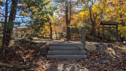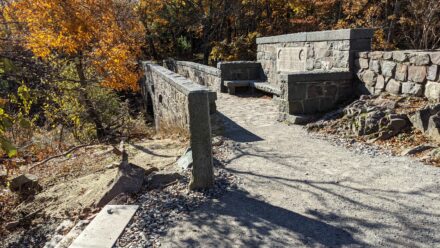 The first phase of construction at Eliot Tower and Memorial Bridge is complete, after hardscape construction by Lawrence Lynch Corporation and erosion control seeding by MON Landscaping in summer and fall 2021. These early 20th century structures at the DCR-managed Great Blue Hill Reservation are part of a larger loop trail constructed as a memorial to the esteemed Massachusetts landscape architect Charles Eliot. Work completed in 2021 includes installation of stabilized stone dust paths, boulder edging, stone paving, and erosion control seeding—together providing improved access to the historic structures and addressing surrounding erosion issues. This work also represents an important first step toward improving accessibility for the larger memorial loop.
