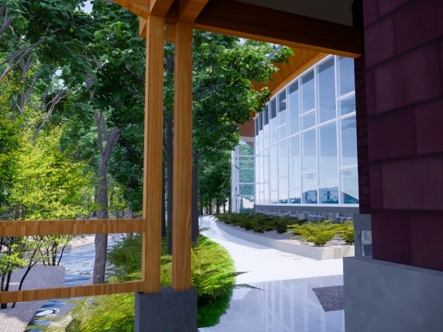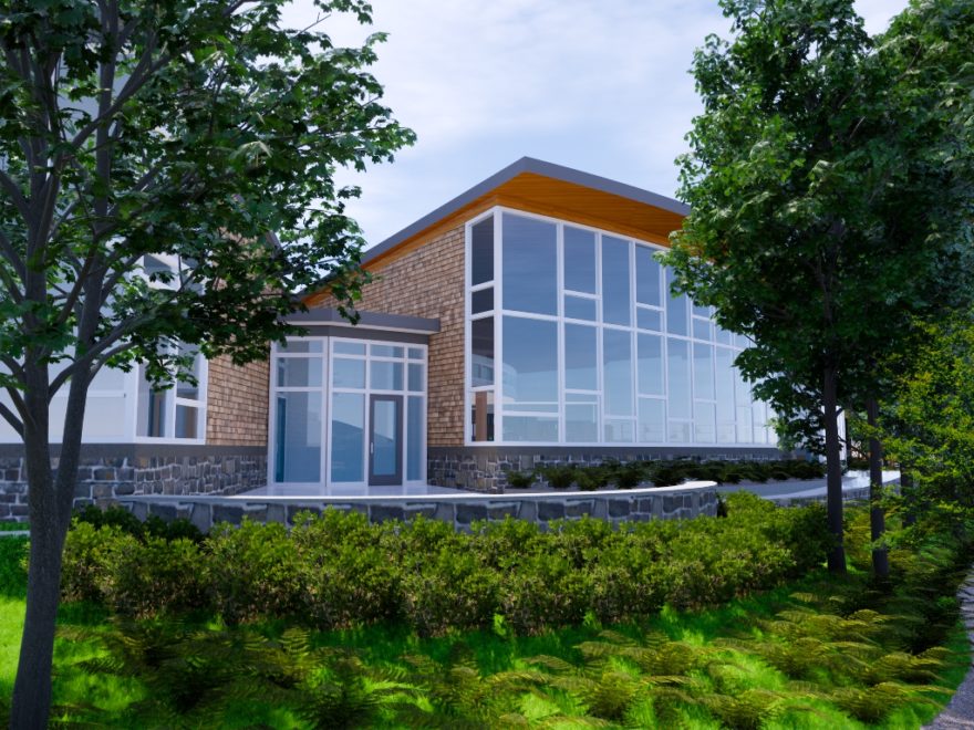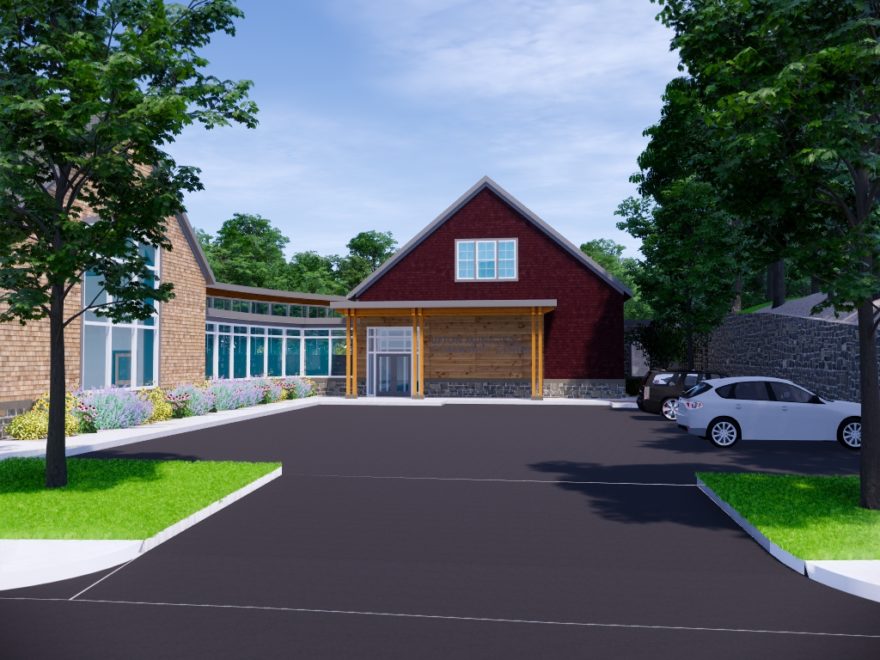 Upton’s library is currently located in the nearby historic Knowlton-Risteen building, which has insufficient space for desired programming and is not fully accessible. Dodson & Flinker’s has explored the development of two potential sites in town. Both designs would include an outdoor terrace with a stone retaining wall overlooking Center Brook, as well as native gardens and additional street trees.
