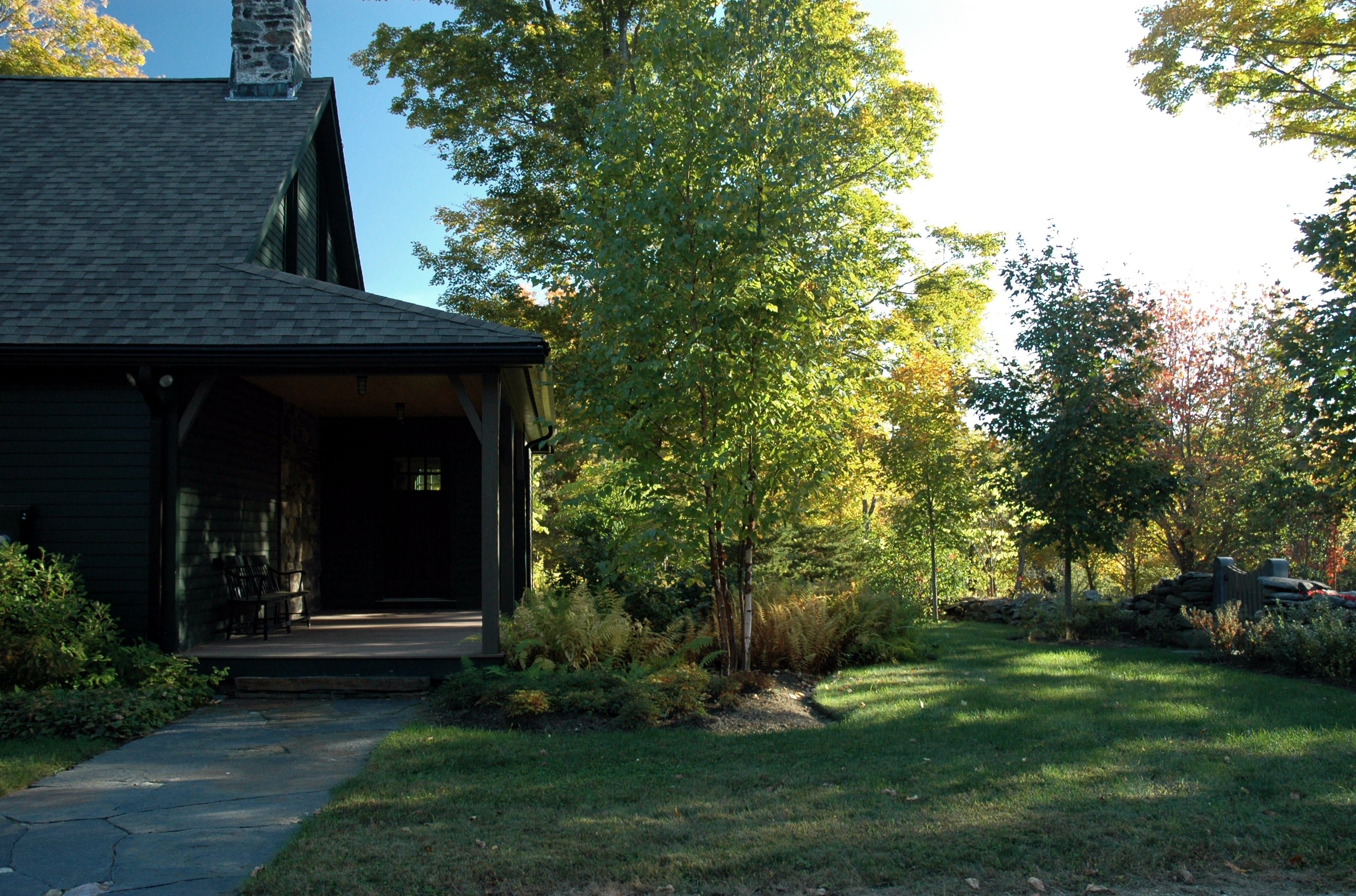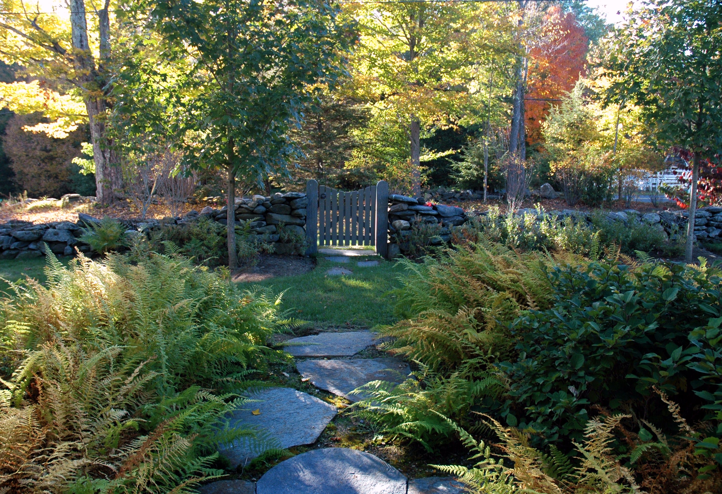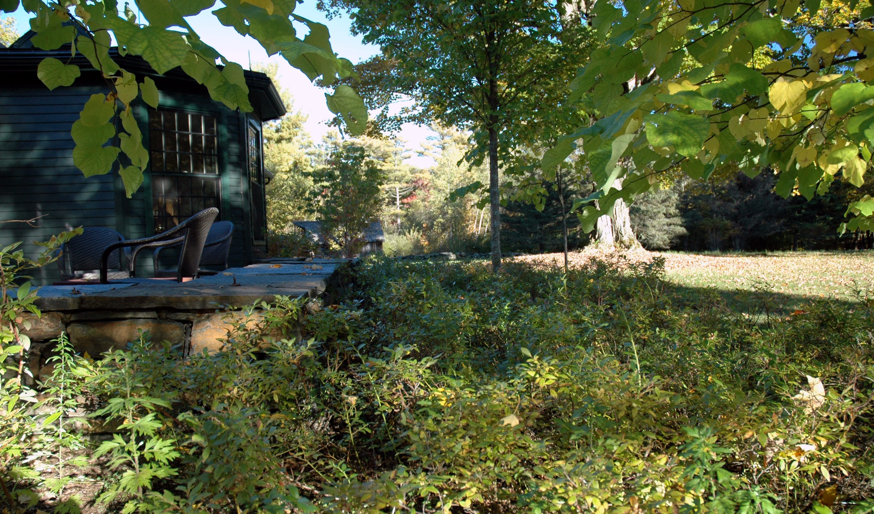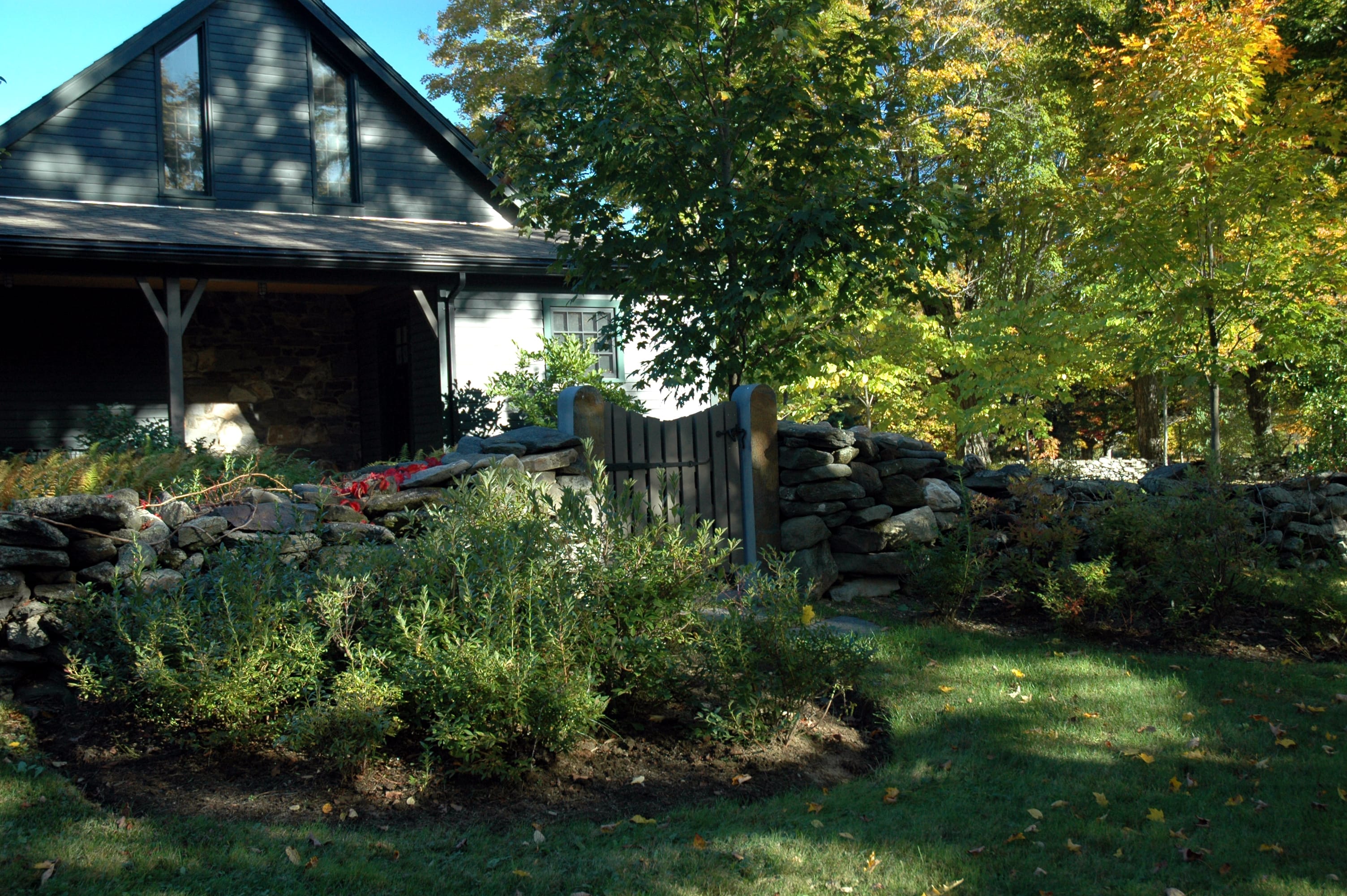 Site plan, construction documents, bidding and construction observation for an historic garden landscape surrounding a renovated hunting lodge in rural western Massachusetts. Historic components of the landscape, including 150 year-old sugar maples, stone walls, meadows and fields were preserved and restored. Extensive new plantings were installed that blended with the history and ecology of the site. Views to surrounding fields and woodlands were enhanced while screening vegetation was planted to provide privacy from a nearby road and residence. New stone walls, pathways, gates and terraces were built to create transitions from the house to the outlying rural landscape. A new vegetable garden, a children’s garden and a fruit tree orchard were included in the plan. Driveways and parking areas were realigned and resurfaced to create clearer circulation and to eliminate excess paving. New plantings included flowering native trees, shade trees, a grove of paper birch. Specimen White Oaks and disease resistant American Elms and American Chestnuts were planted to create landscape focal points.