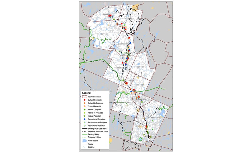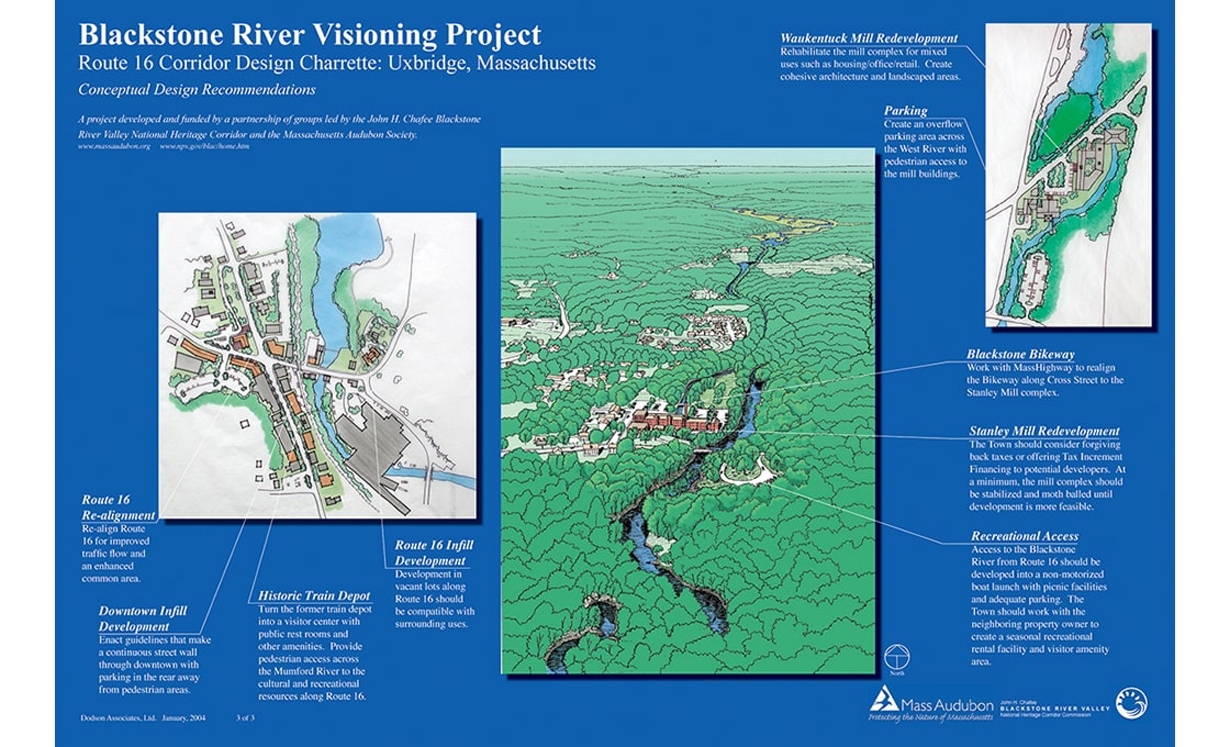 In partnership with a coalition of environmental groups, economic development organizations, the Massachusetts Audubon Society and the Blackstone River Valley National Heritage Corridor Commission, Dodson & Flinker completed a Visioning Plan for eleven communities along the main stem of the Blackstone River in Massachusetts and Rhode Island. The project began with a series of eight public workshops that allowed residents to outline issues, concerns and dreams for their community’s stretch of the river, and to identify on maps and aerial photographs areas that should be the focus of further study. In the second phase of the project, four design charrettes were held at key locations along the Blackstone River. The sites were chosen to represent a range of typical issues and challenges faced by many different towns. The resulting design and planning strategies, while specific to those locations, can be applied to similar situations throughout the river corridor.