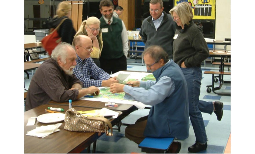 The Borderlands Village Innovation Pilot Project was established to help two towns on either side of the Connecticut-Rhode Island Border explore ways to redevelop village centers while protecting one of the largest undeveloped areas in the Boston-Washington metropolitan corridor. Leading a team that included ForeSee Consulting and the Consensus Building Institute, Dodson & Flinker, Inc. helped each town explore the heart and soul of the community and develop a shared vision for the future. Rooted in an understanding of people and place, those visions are designed to foster appropriate growth and development while protecting the things people love about their town. The consulting team helped each town shape an extensive public engagement process, including innovative approaches to getting residents to say what they care about and explore alternatives for the future. These included web-based surveys, interactive keypad polling — as well as old-fashioned interviews and one-on-one conversation. In Killingly, participants met in small groups to explore options for a critical highway corridor, developing a vision where growth pressure is used to turn an old commercial strip into a revitalized, pedestrian-friendly village center.