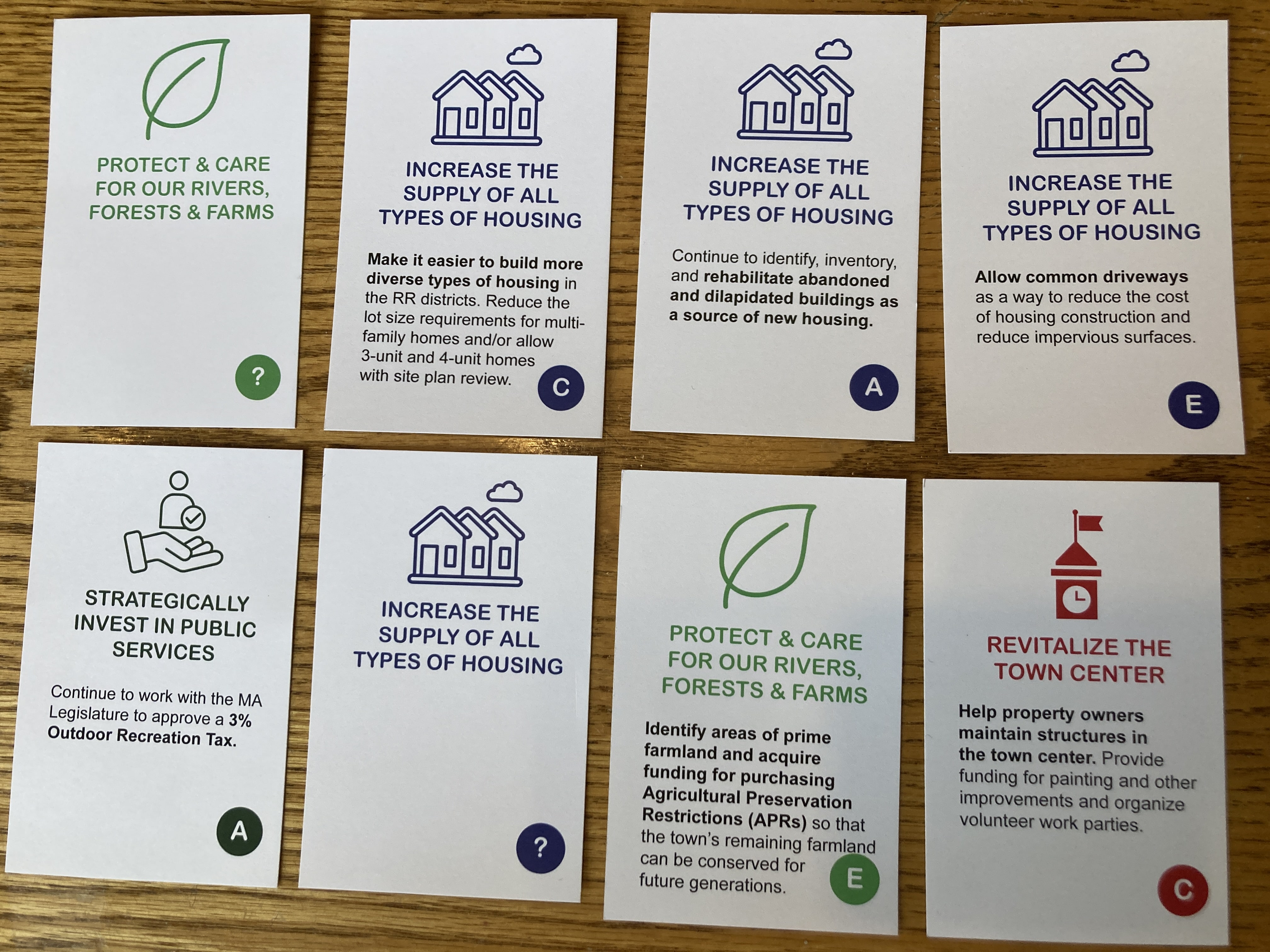 Dodson & Flinker worked with local stakeholders in identifying which components of the previous Master Plan were still relevant, and which sections needed to be updated. To encourage creative input from residents, business owners, and board and committee members, Dodson & Flinker employed hands-on tools such as a scaffolded brainstorming exercise with a series of visioning prompts, Mad Libs-style vision statements completed by participants, and a custom card game in which participants prioritized, took ownership for, or discarded potential actions for the plan. A key focus throughout was strengthening resilience, as much of Charlemont’s critical infrastructure—including emergency services and Route 2, the town’s main thoroughfare—lies within the Deerfield River floodplain. The resulting plan reflects Charlemont’s values, constraints, and opportunities, offering clear, implementable steps to guide future growth, support economic vitality, protect natural resources, and build long-term community resilience.