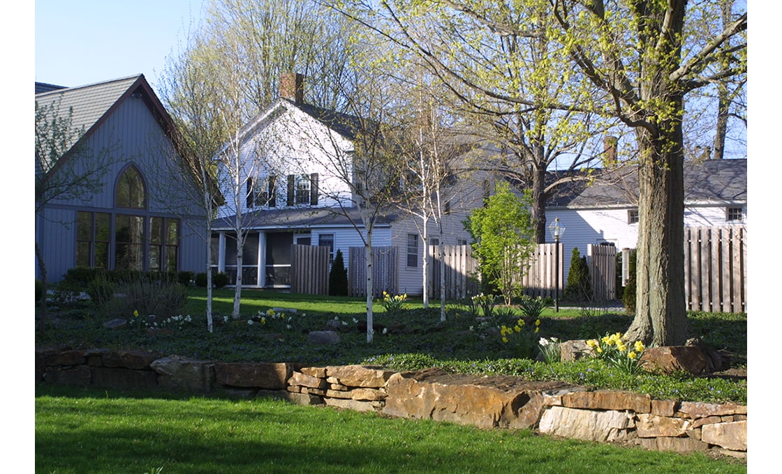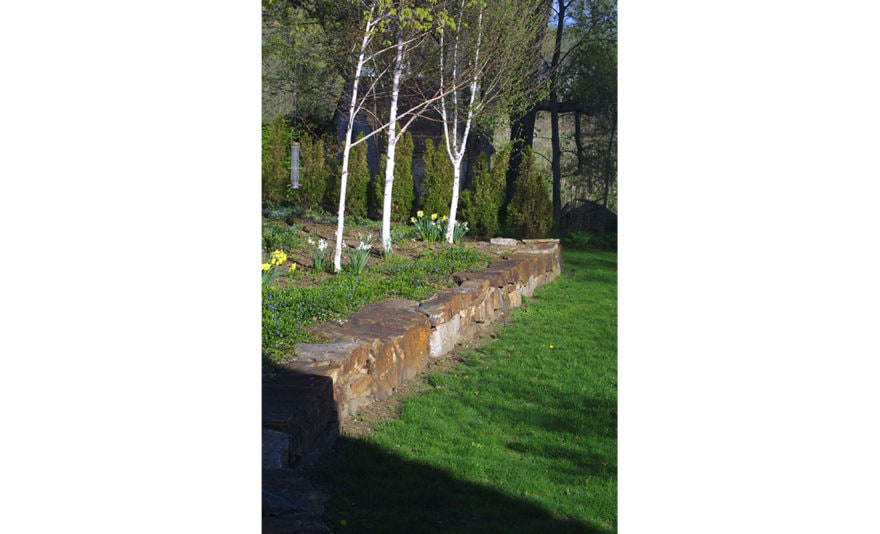 Dodson & Flinker completed the site design for a contemplative garden adjacent to a historic stone Episcopal Church in the scenic New England village, Sheffield. The garden includes a grove of birch trees, a recessed stone sitting wall, pathways, a columbarium, a fountain and a lawn providing views over the Housatonic River marshes. Native stone for the retaining walls was cut from the same quarry that supplied stone for the church in the 1920’s. The design of the garden was the result of extensive collaboration with the church building committee. The retaining wall serves both as a seating wall and as a columbarium for the burial of ashes. The garden is used for contemplation, prayer, outdoor services, weddings and informal gatherings.