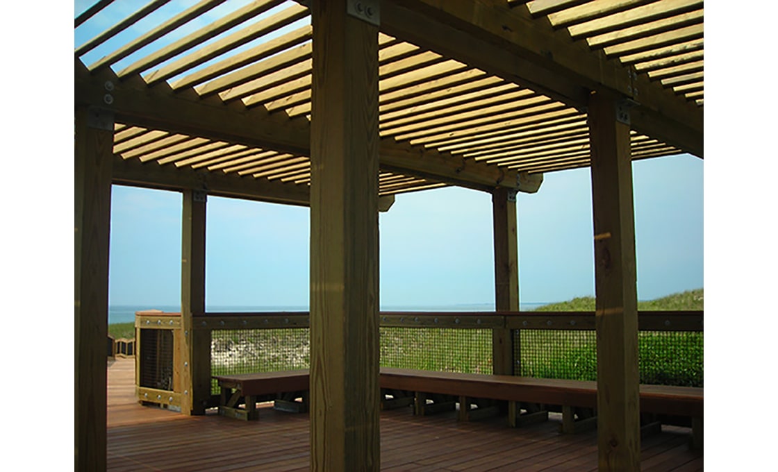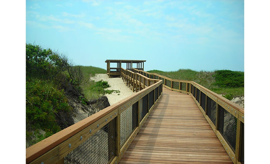 Comprehensive renovation of park facilities and plantings at the second most popular beach in the Massachusetts Park System. The project includes a masterplan as well as construction documents for two new satellite bathhouses with composting sanitary facilities serving two parking lots of over 1,200 cars each. The proposed bathhouses were designed in a shingle style reminiscent of a 19th c. beach bathhouses, providing accessible access to new elevated, Ipe wood dune crossings. The dune crossings provide access to the beach while separating visitors from Piping Plover habitat and allowing the primary dunes to re-establish and shift beneath them. All plantings meet rigorous Conservation Commission and Coastal Zone Management requirements to both be tough enough to stabilize newly establishing dunes subject to heavy winter storms or hurricanes and to be native to this specific County in Massachusetts. After the bathhouses were constructed, Dodson & Flinker focused on the renovation of the central Beach Service Plaza with administrative, lifeguard, sanitary and concession facilities. These buildings are all being elevated to allow a storm surge to flow underneath. At full build-out of the Masterplan, impervious surface at the Central beach Services Plaza will have been reduced by over 50% and all buildings will have been relocated out of the Flood Velocity Zone. Client: Department of Conservation and Recreation, Ruth Helfeld