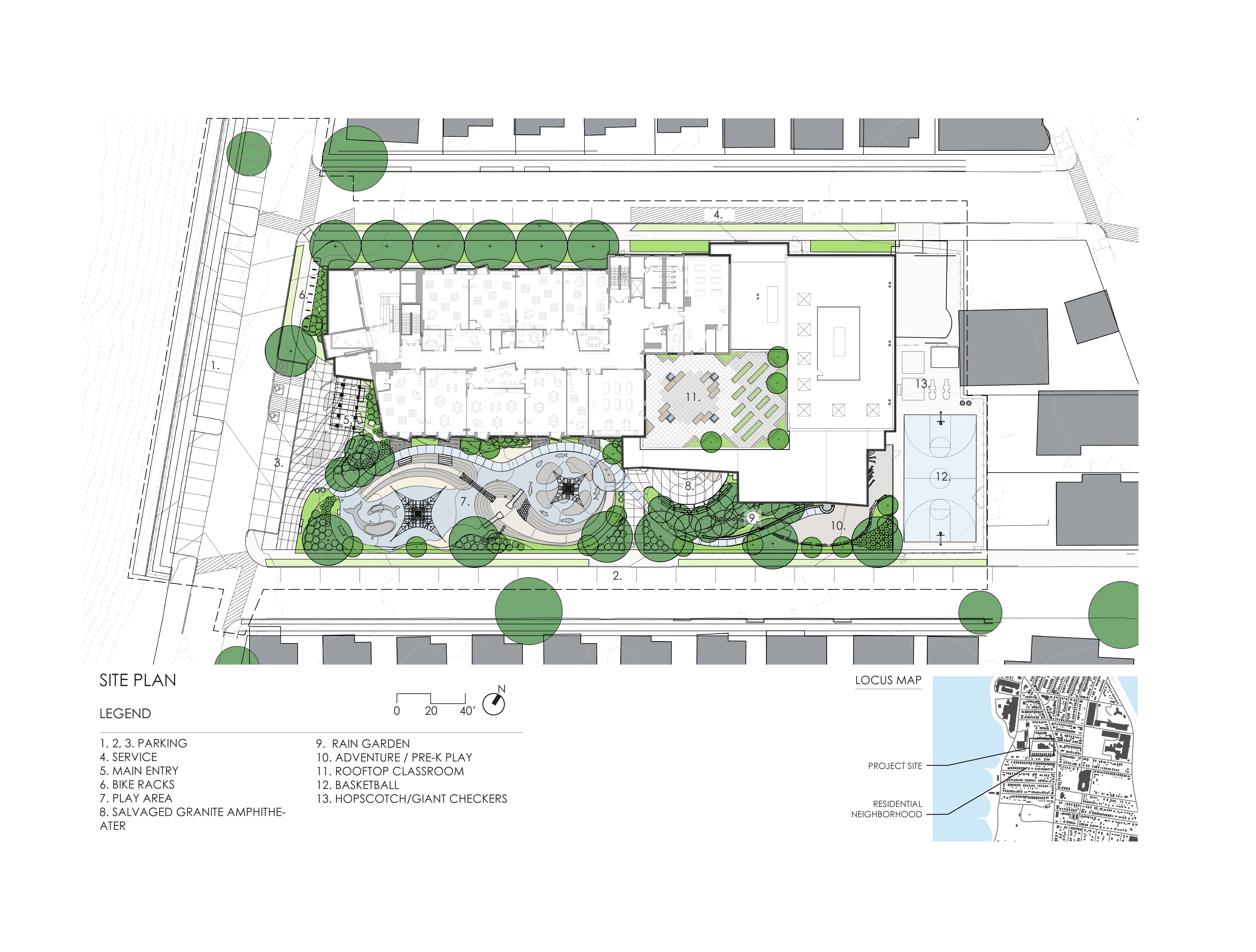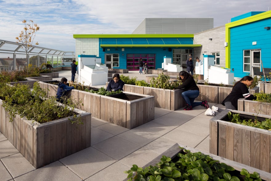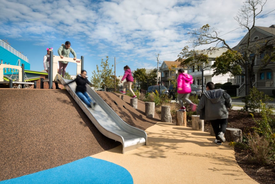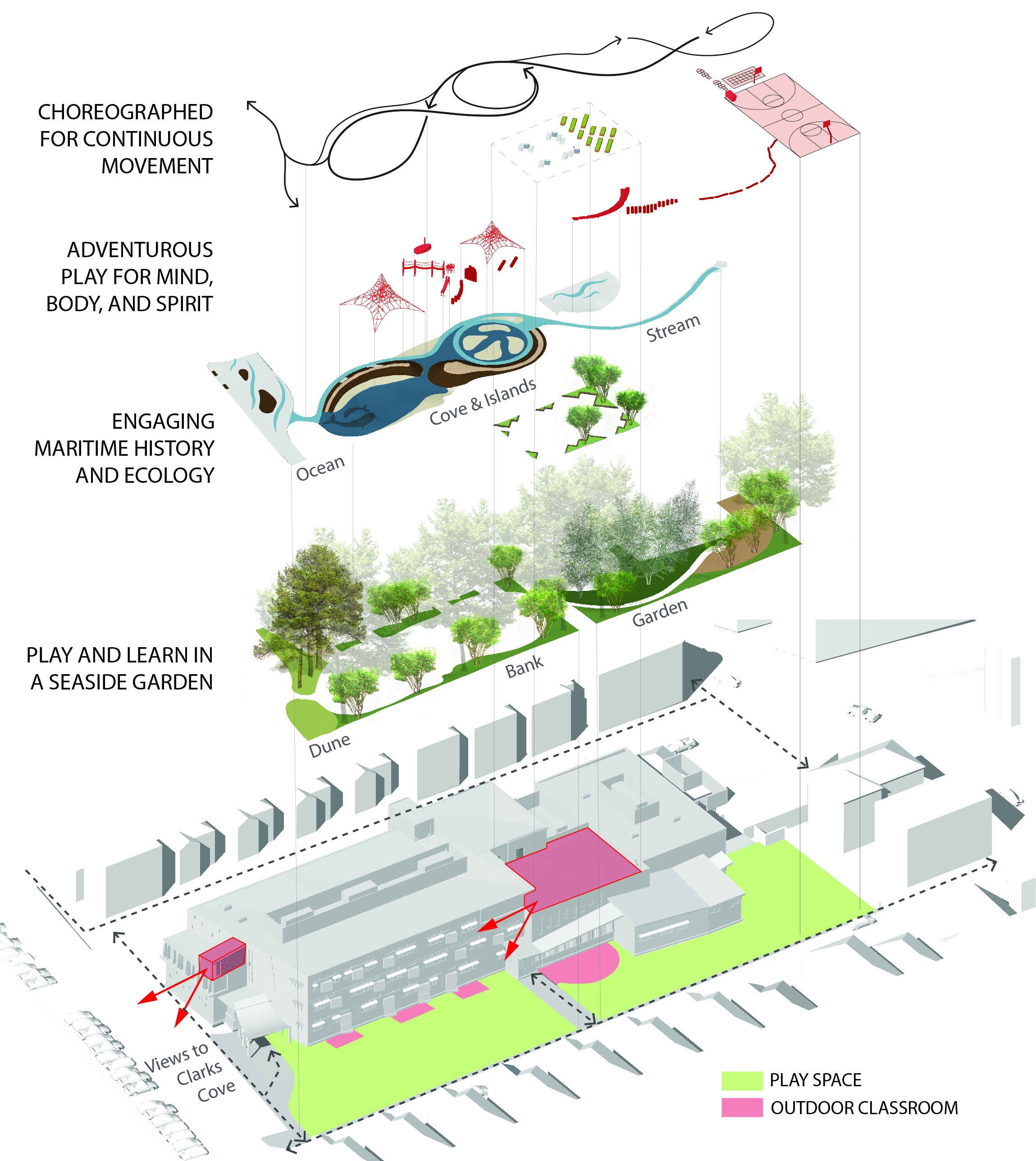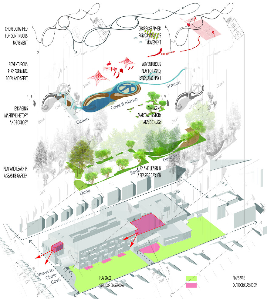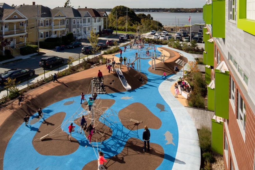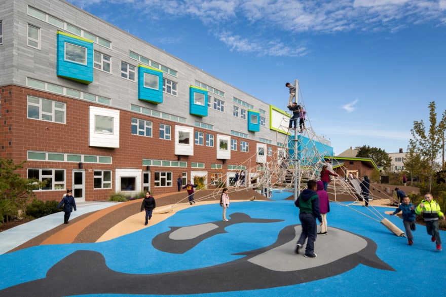 Students at New Bedford’s Irwin M. Jacobs Elementary School welcomed the new school year with a new playground, after the new space designed by Dodson & Flinker opened to students in early September 2018. The project was completed in collaboration with Turowski2 Architecture of Marion, MA, who designed the 74,025 square foot building to house 430 students in grades Pre-K through 5. The school, which looks out over New Bedford’s East Beach to Buzzards Bay, is ideally situated to connect students with local coastal ecology and their city’s centuries-old maritime history. Dodson & Flinker’s design includes an ocean-themed adventure playground, an outdoor classroom, interactive stormwater management features, and a rooftop garden to enhance students’ understanding of their local environment and bring learning outside the building’s walls.