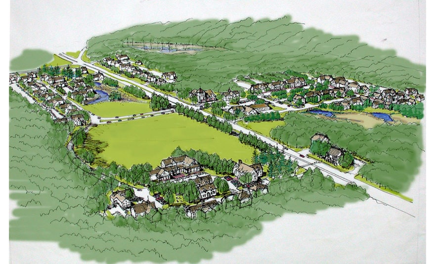 Dodson & Flinker’s first recommendation was to expand the study area beyond the borders of a single parcel to include the logical, functional boundaries of the neighborhood, incorporating at least ten different properties. The final plan shows development areas and open space to be protected, roads, parking lots, buildings, paths, and landscaping. While the masterplan is specific, it is not the only possible plan for the site — rather, it is meant to demonstrate the planning and design principles that more detailed future plans should be based on. These principles can also help the town review development proposals. Among the first of these principles should be the idea of design as a partnership between landowners, developers, town officials, and the public.
