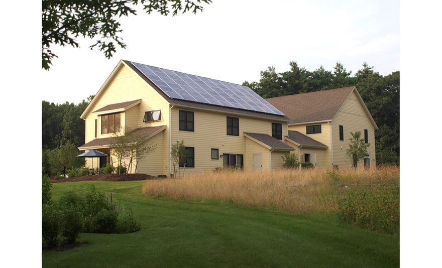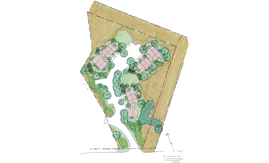 The unique character of Wayland results from a special combination of historic architecture, rural vistas, roadside trees, and natural areas. By understanding and building on these patterns, plans for the site will reflect the sense of place that defines the community. In addition to architecture that is based on the local vernacular, the landscape will be designed to reflect local traditions. Plant materials will include native trees and shrubs, and selected ornamentals from the traditional New England garden. Stone and wood will be used for walls and fences, which will be designed to fit into a somewhat rolling landscape to enclose and shelter homes and outdoor gathering areas. Garden areas will be provided, allowing residents to grow their own vegetable and fruit and compost yard waste and vegetable trimmings. These elements, designed to reflect local traditions of rural life, will be surrounded by natural areas: preserved groves of trees, grasslands filled with birds and butterflies, and wetlands that store and filter stormwater runoff while adding to the beauty of the community.