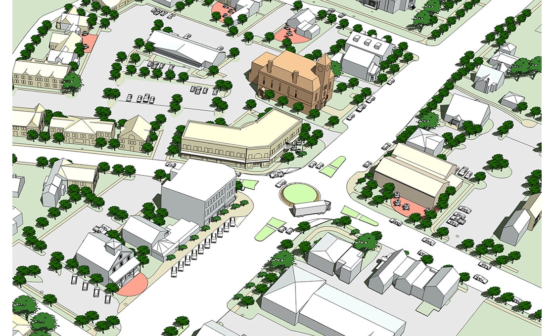 Dodson & Flinker, Inc. developed three concepts for appropriate infill, preservation, and redevelopment of Downtown Oxford, based on three distinct traffic scenarios and community participation in the form of an evening charrette and several public meetings. Preservation of existing historic structures was prioritized, as was maximizing parking and enhancing the pedestrian experience.