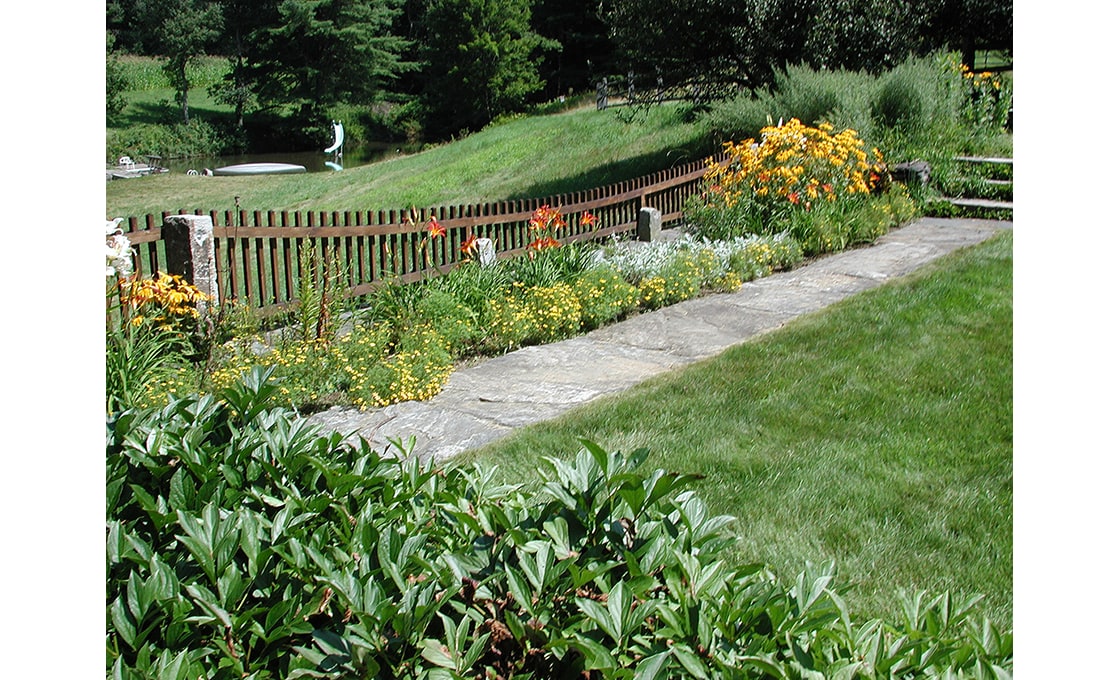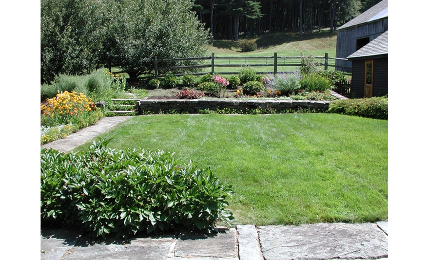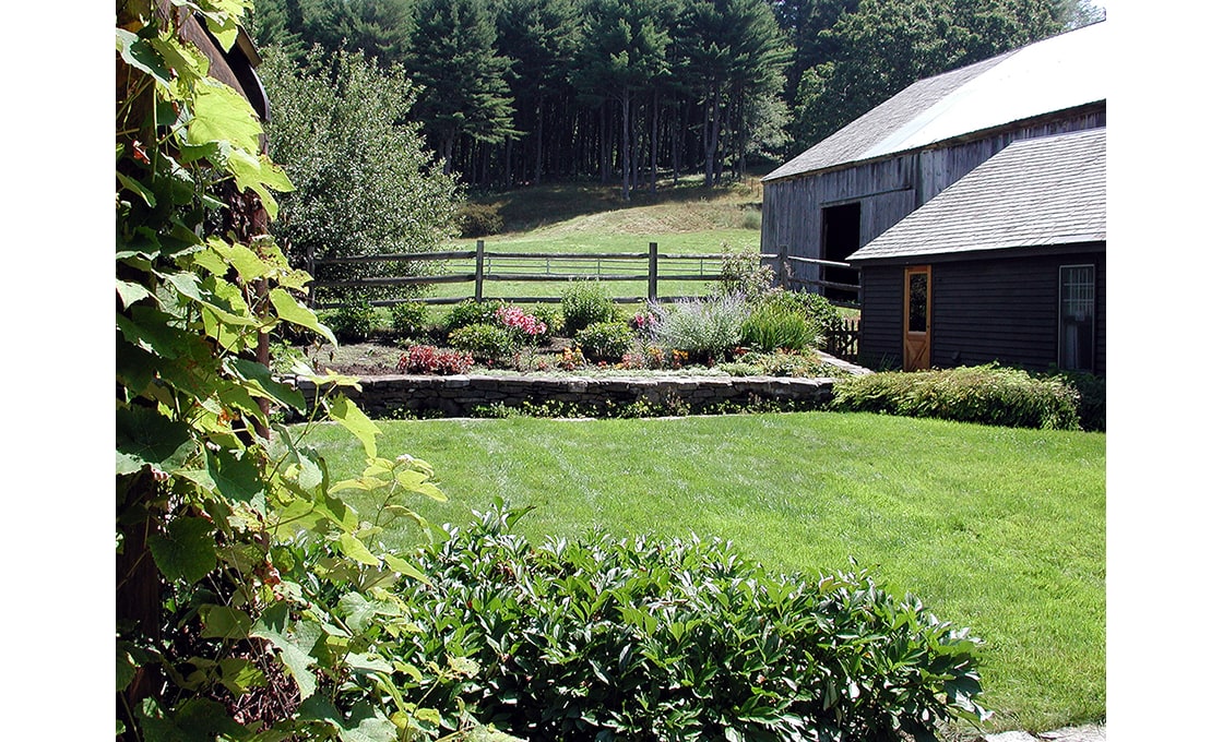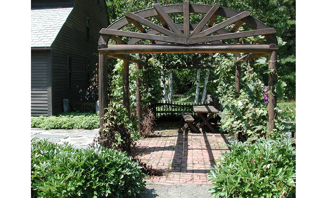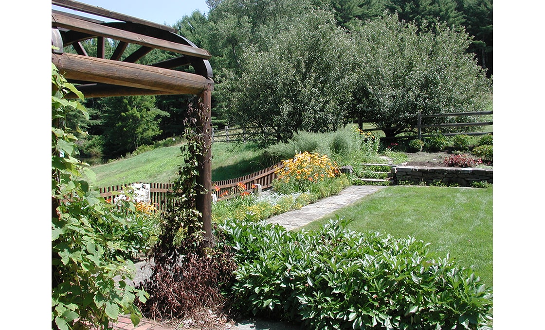 Dodson & Flinker designed a garden, patio and pergola for the North side of this 1779 Colonial – one of the oldest in Shelburne. The main goal in this project was to create the kind of outdoor living spaces and perennial beds that the clients wanted but in a design that matched this very austere and stripped down residence. Originally there was a steep hillside on the north side that led down to a lower meadow, small pond and creek. Dry-laid stone retaining walls were used to create several flat terraces at different elevations. Cedar picket fences with granite posts were used to further define these outdoor spaces. The picket fence immediately in front of the master bedroom had its centerpoint dropped in a gentle curve so as to lead the eye out to the meadows beyond without interruption. Granite capstones salvaged from under a parking lot in the town center were used for walkways and a patio directly outside of the dining room. This stone paving connected to a white cedar pergola planted with grapevines and Clematis. The pergola was intended to provide shade and an inviting place to sit right at the edge of the retaining wall drop-off, overlooking the meadow below. Ferns and perennials were used in simple, large masses to reflect the strong masses of the historic building and the simplicity of landscaping that would have prevailed at the time of the farm’s early occupation.