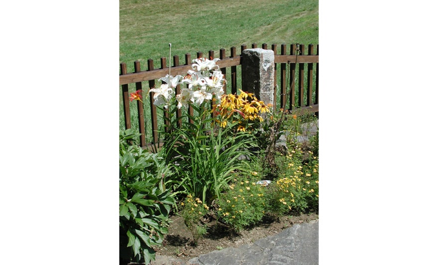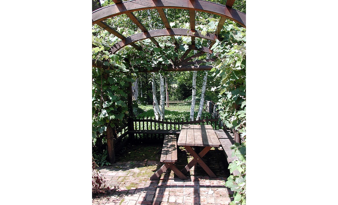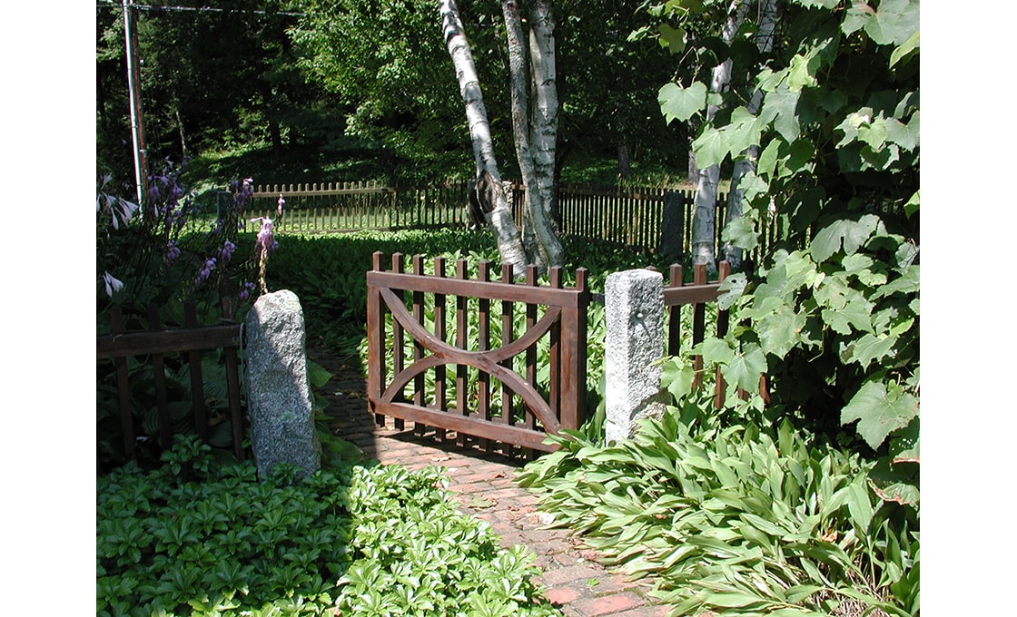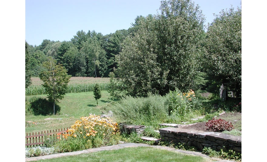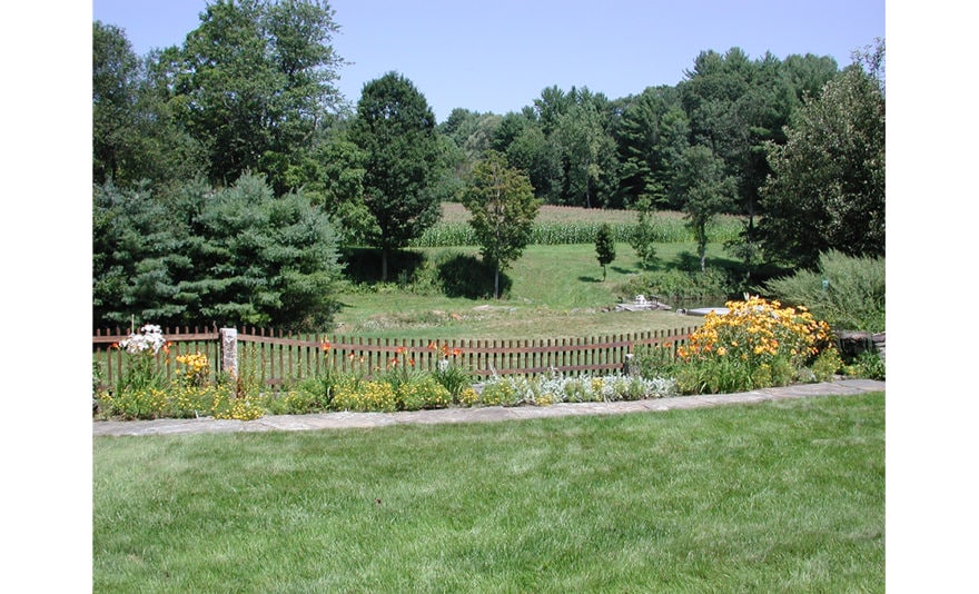 Dodson & Flinker designed a garden, patio and pergola for the North side of this 1779 Colonial – one of the oldest in Shelburne. The main goal in this project was to create the kind of outdoor living spaces and perennial beds that the clients wanted but in a design that matched this very austere and stripped down residence. Originally there was a steep hillside on the north side that led down to a lower meadow, small pond and creek. Dry-laid stone retaining walls were used to create several flat terraces at different elevations. Cedar picket fences with granite posts were used to further define these outdoor spaces. The picket fence immediately in front of the master bedroom had its centerpoint dropped in a gentle curve so as to lead the eye out to the meadows beyond without interruption. Granite capstones salvaged from under a parking lot in the town center were used for walkways and a patio directly outside of the dining room. This stone paving connected to a white cedar pergola planted with grapevines and Clematis. The pergola was intended to provide shade and an inviting place to sit right at the edge of the retaining wall drop-off, overlooking the meadow below. Ferns and perennials were used in simple, large masses to reflect the strong masses of the historic building and the simplicity of landscaping that would have prevailed at the time of the farm’s early occupation.