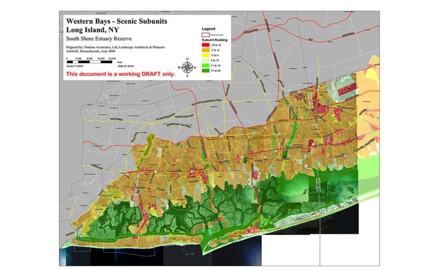 The Long Island South Shore Estuary Reserve stretches over 80 miles from the eastern edge of Kennedy Airport to Shinnecock Bay in Southampton. The extensive barrier beaches, dunes, tidal marshes and upland forests of the region remain surprisingly intact despite intensive development of portions of the shoreline. Concerned about identifying and preserving the scenic character of the region, the New York Coastal Management Program and the Long Island South Shore Estuary Reserve Office hired Dodson & Flinker to complete a comprehensive survey of the region’s visual landscapes. Dodson & Flinker used GIS analysis to define visual zones within the reserve and ranked them based on the results of the online visual preference poll. Interconnected greenway networks provide corridors for wildlife, passive recreation and scenic viewing. Implementation of New York State’s Scenic Areas of Statewide Significance (SASS) program may be considered to provide a measure of protection to identified scenic resources.